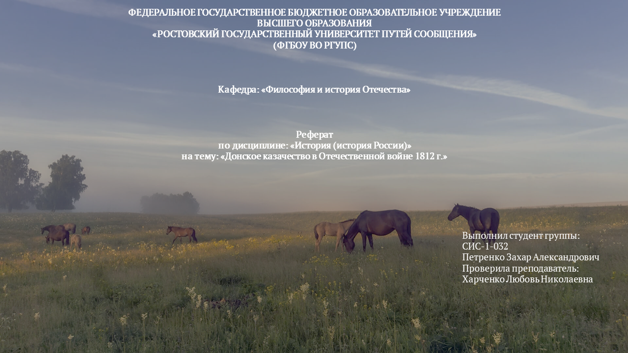 Окончилась трёхлетняя тяжёлая борьба. Из этой кровавой, нечеловечной борьбы Россия вышла победительницей. Глубокая вера в бога, верность царю, горячая любовь к Родине её верных сынов преодолели все невзгоды и лишения. Наши предки-герои побороли все непомерные труды, все замысли Наполеона, силы всей Западной Европы. Мы помним деятельность героев-донцов, их подвиги, их заслуги перед Родиной. Многие пали героями. Их кости раскинуты на тысячах вёрст в России и в Западной Европе. За каждую смерть казака враг платил гибелью десятков и сотен своих солдат. Умирая, каждый знал, что своей смертью он подготовляет победу, торжество своей Родины над врагом.