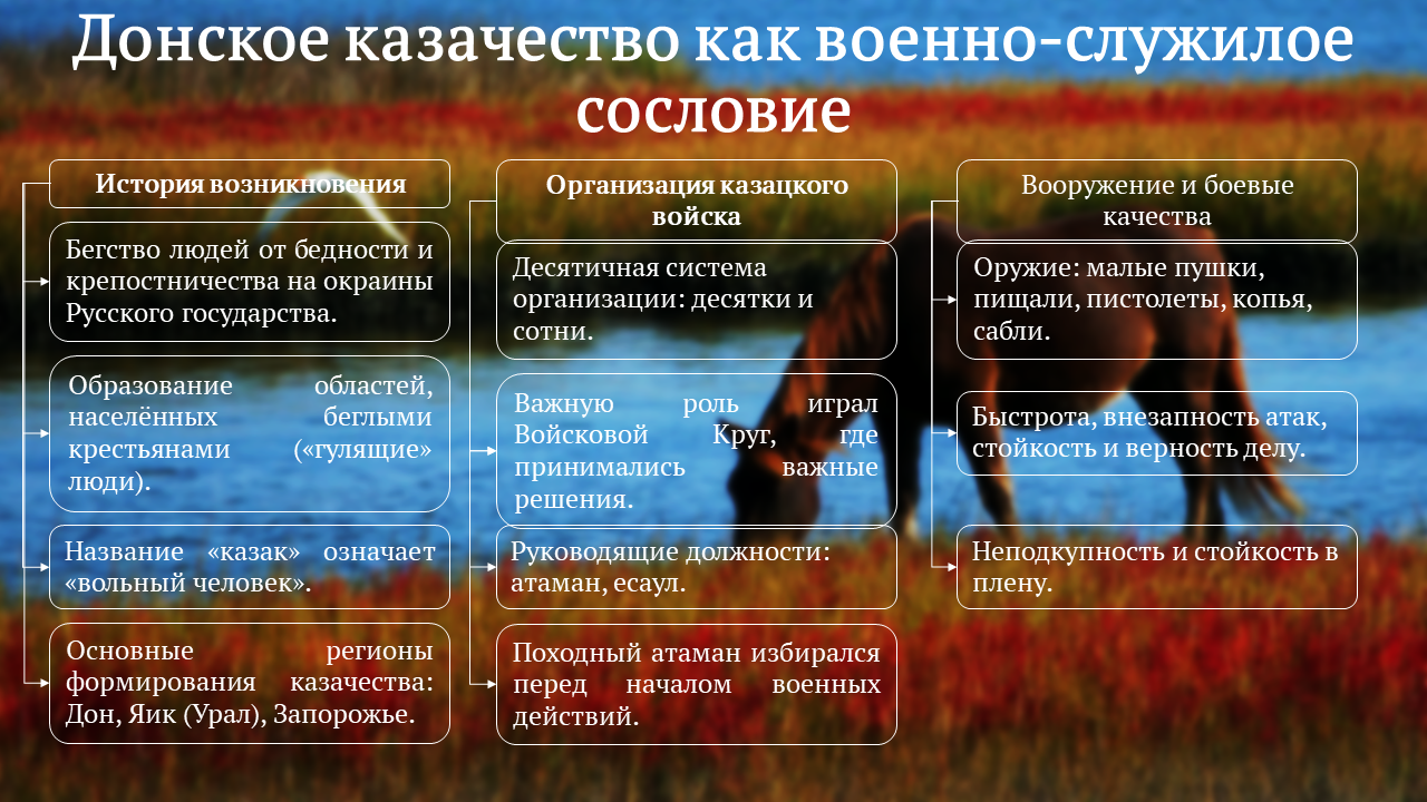 Трудно было простому человеку в Русском государстве из-за бедности, нищеты, крепостной неволи. Некоторые люди, не желая терпеть своё бесправное положение, бежали на окраины страны. Их разыскивали и возвращали на прежние места, но их становилось так много, что сыщики не успевали их разыскивать. К тому времени на окраинах Руси возникали целые области, заселённые беглецами. Их называли «гулящими» людьми. Люди стали называть себя казаками. Слово «казак» нерусское и означает «вольный человек». Первые казачьи области возникли на реках Дон, Яик (Урал), в Запорожье. На речных берегах строили небольшие деревянные крепости. В этих крепостях жили казаки. Правительство решило поставить их на службу и обязало охранять границы от «незваных» гостей.