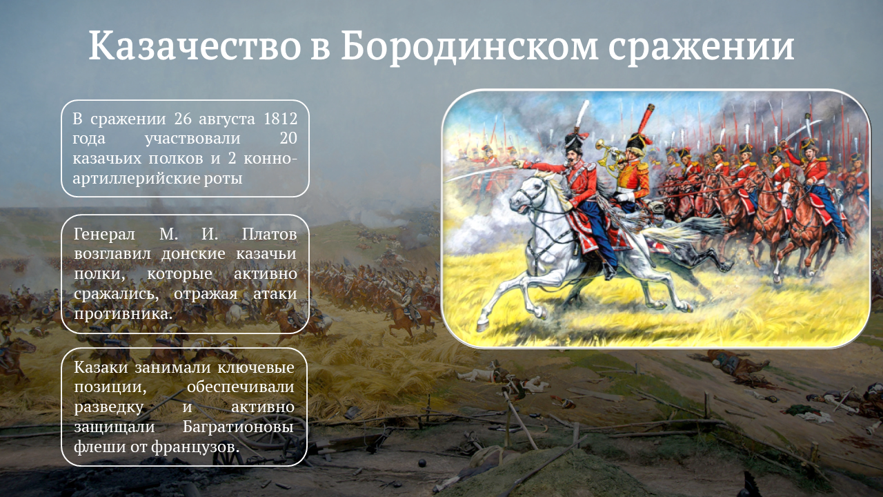 В Бородинском сражении 26 августа 1812 года в составе русской армии участвовали 20 казачьих полков и 2 конно-артиллерийские роты. 25 августа войсковой атаман генерал от кавалерии М. И. Платов возвратился из Москвы, вступил в командование донскими казачьими полками.14 казачьих полков и 2-я рота донской конной артиллерии войскового старшины П. В. Суворова составляли корпус под командованием Платова, также казачьи полки были включены в кавалерийский корпус Ф.П. Уварова. Отдельный отряд численностью 8 казачьих полков входил в резерв левого крыла русской армии, который прикрывал направление на Москву по Старой Смоленской дороге у деревни Утицы. 1-я рота донской конной артиллерии находилась в линии полков, успешно отражала попытки противника овладеть Багратионовыми флешами. Сильная партия донских казаков в разведке обнаружила несколько колонн пехоты и скрытую в лесу артиллерию противника. Неприятель принял движение казаков за атаку и послал стрелков, которые открыли огонь по казакам. Под натиском противника русские войска уступили французам д. Утицы, а затем и Утицкий курган. Вскоре казаки стали активно нападали на тылы и фланги противника, нанося ему ощутимый урон. Донские казаки активно включались в другие операции русской армии. Нападая на кавалерию и пехоту противника, казаки искали слабые места в его боевых порядках, уничтожали разведчиков, канониров и фуражиров, вели наблюдения за передвижением врага. Платов обратился к М. И. Кутузову с просьбой разрешить казакам «совершить диверсию в тыл противника». И казаки совершили диверсию: они вихрем проносились между рядами вражеской пехоты, стреляли из винтовок и пистолетов, жалили противника своими длинными пиками. Наступление французской армии в центре и на правом фланге было остановлено. Почти два часа император Франции выяснял оперативную обстановку, и лишь в 14 часов он начал 3-ю атаку на Багратионовы флеши и с. Семёновское.