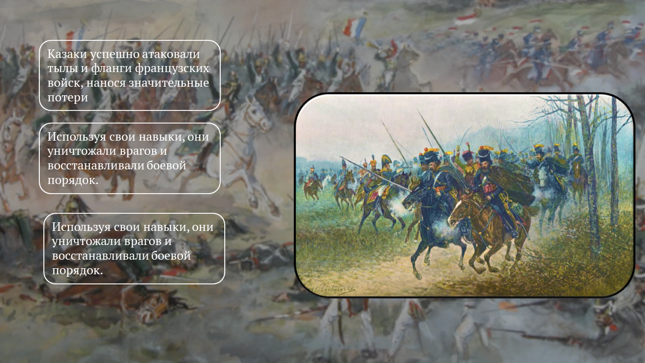 Таким образом, казаки сыграли решающую роль в победе над Наполеоном, продемонстрировав свою храбрость, находчивость и умение наносить сокрушительные удары по противнику.