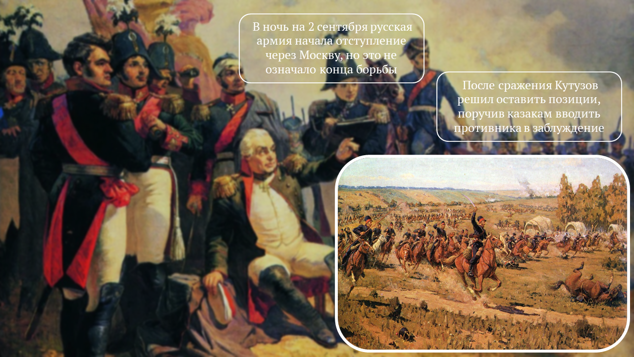 На совете в д. Фили Кутузов принял решение оставить Москву. Он сказал, что «С потерей Москвы ещё не потеряна Россия.» В ночь на 2 сентября началось отступление наших войск через Москву. Но оставление столицы не означало, что русские закончили войну. Они разгорались всё большей и большей жаждой мести, жаждой кровавой борьбы до полного уничтожения врага.
