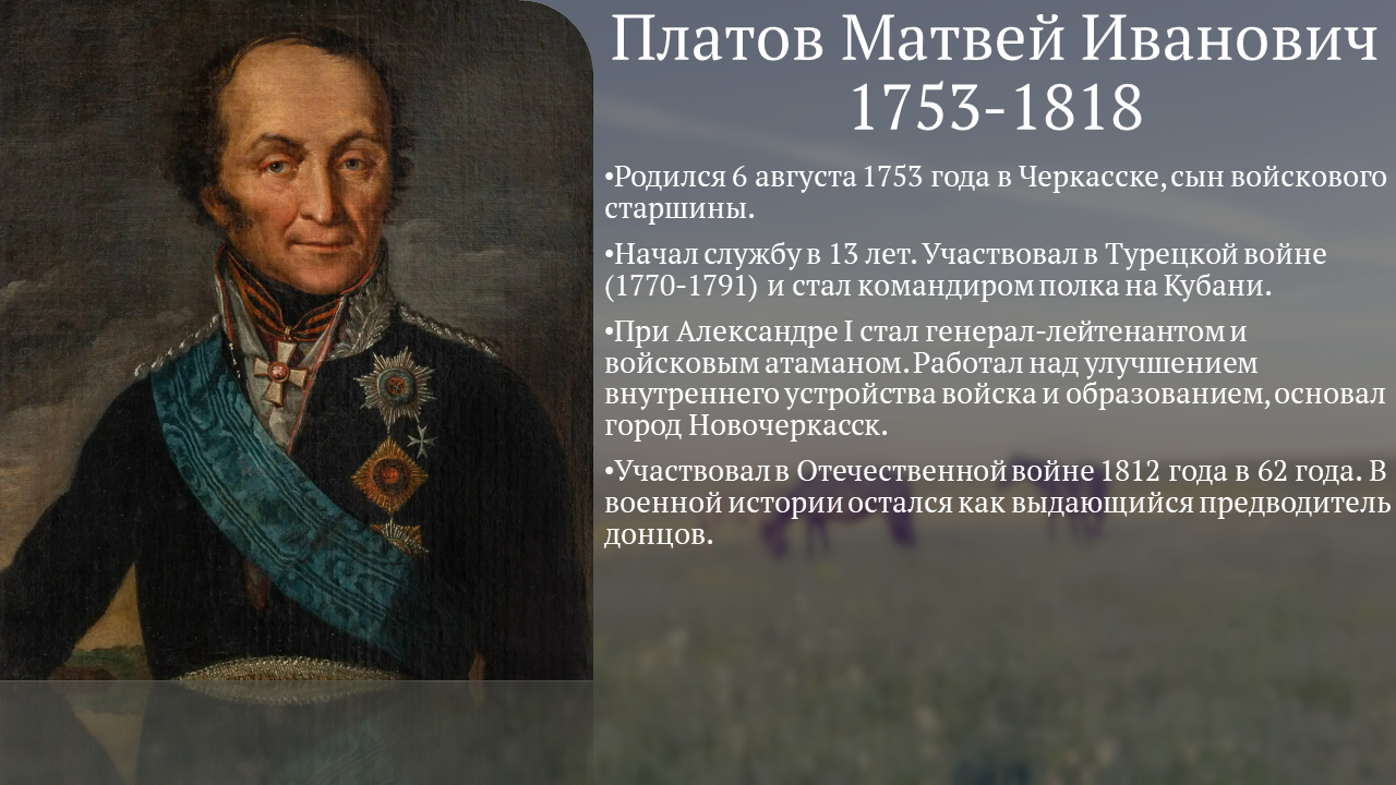 Матвей Иванович Платов родился на Дону 6 августа 1753 года в Черкасске и был сыном войскового старшины. С детства был сообразительным, храбрым и смекалистым. В 13 лет поступил на службу урядником. Вскоре за отличия был произведён и офицеры. В 1770 году принимал участие в турецкой войне. После войны служил на Кубани в должности командира полка. Здесь участвовал во многих боях с черкесами и татарами. В марте 1774 года у реки Калалы произошла битва казачьего полка с татарами. Донцов было в 20 раз меньше, но благодаря мужеству и храбрости Платова атаки татар были отбиты, а прибытие выручки помогло врагов разбит совсем. Эта битва была яркой и блистательной. На Платова было обращено всеобщее внимание. Позже Матвей Иванович был послан в войска, действовавшие против мятежных шаек Пугачева.